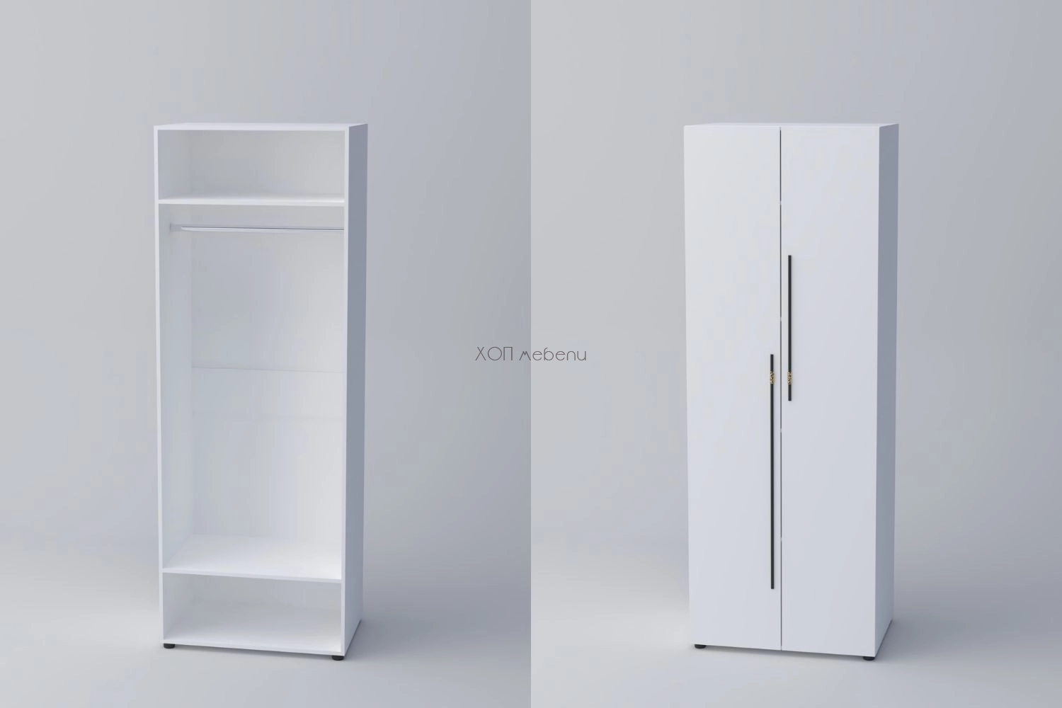 Гардероб с две врати СПЕЙС 1 с височина 220 см. и ширина 80 см. Удобно разпределение и компактни размери. Гардеробът разполага с един лост за закачалки и два рафта.
