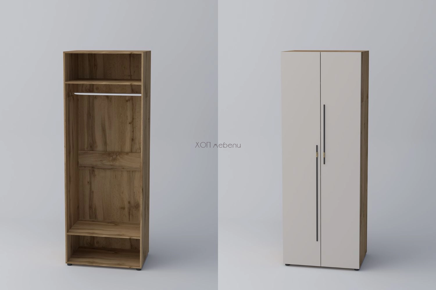 Гардероб с две врати СПЕЙС 1 с височина 220 см. и ширина 80 см. Удобно разпределение и компактни размери. Гардеробът разполага с един лост за закачалки и два рафта.