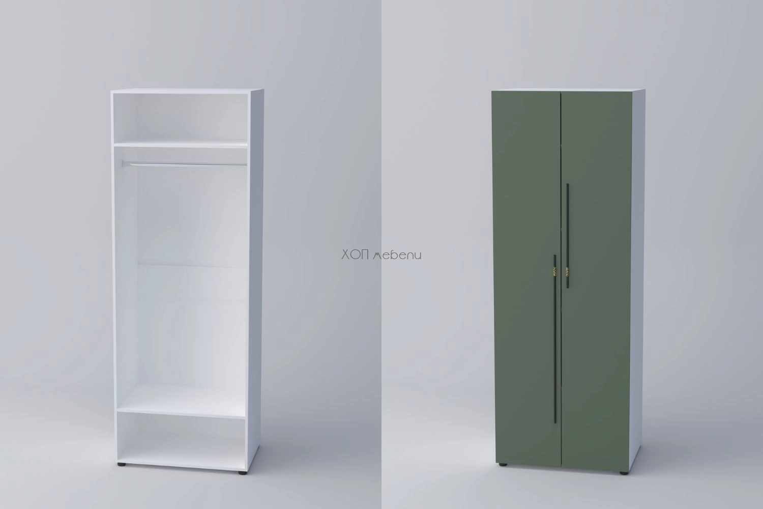 Гардероб с две врати СПЕЙС 1 с височина 220 см. и ширина 80 см. Удобно разпределение и компактни размери. Гардеробът разполага с един лост за закачалки и два рафта.