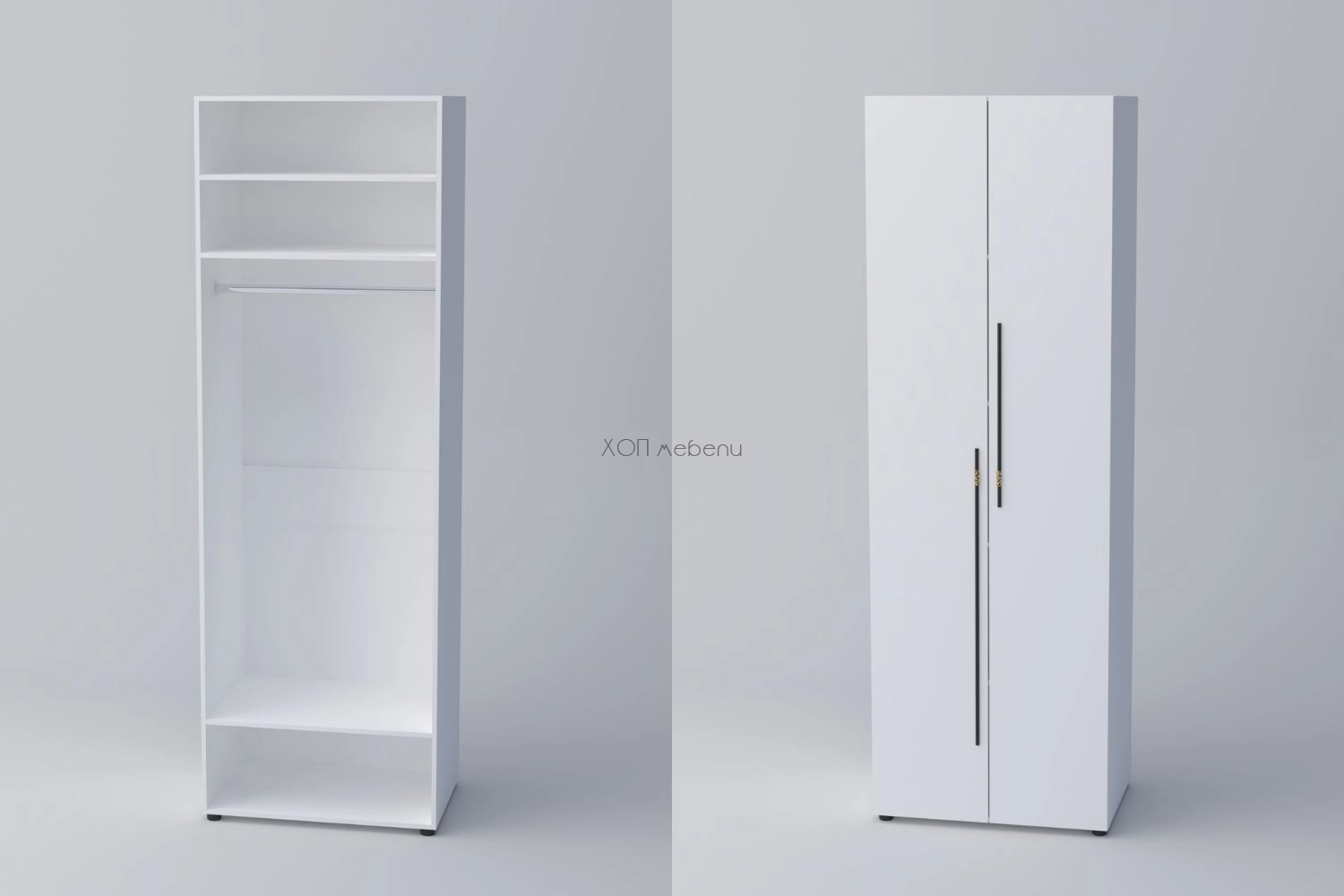Гардероб с две врати СПЕЙС 1 с височина 240 см. и ширина 80 см. Удобно разпределение и компактни размери. Гардеробът разполага с един лост за закачалки и три рафта.
