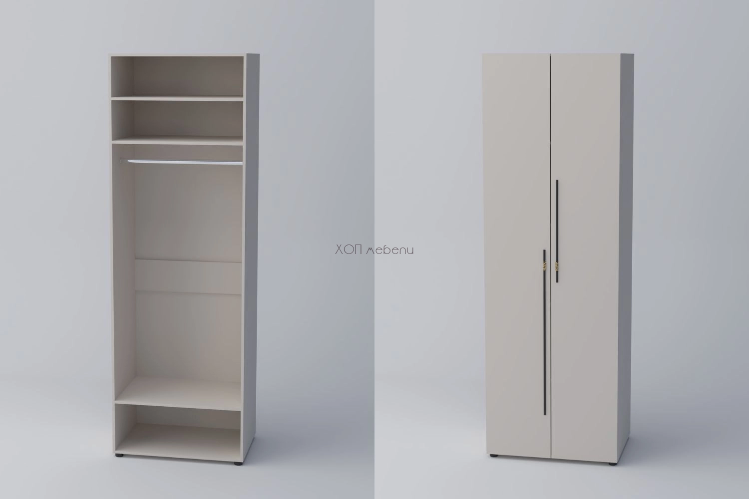 Гардероб с две врати СПЕЙС 1 с височина 240 см. и ширина 80 см. Удобно разпределение и компактни размери. Гардеробът разполага с един лост за закачалки и три рафта.