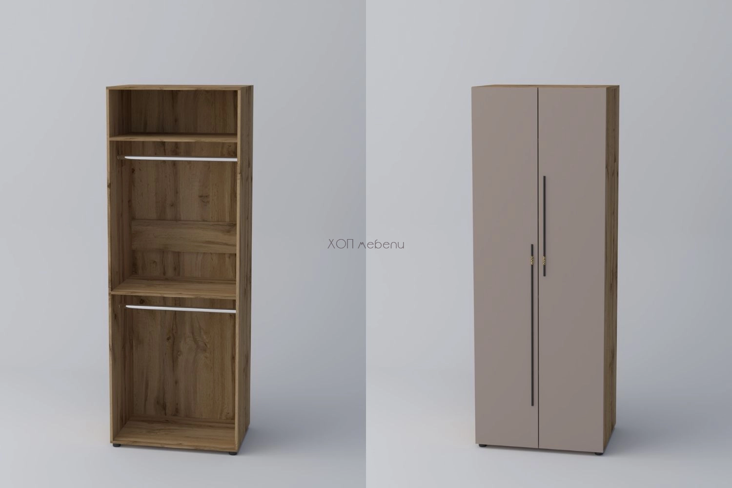 Гардероб с две врати СПЕЙС 2 с височина 220 см. и ширина 80 см. Удобно разпределение и компактни размери. Гардеробът разполага с два лоста за закачалки и два рафта.