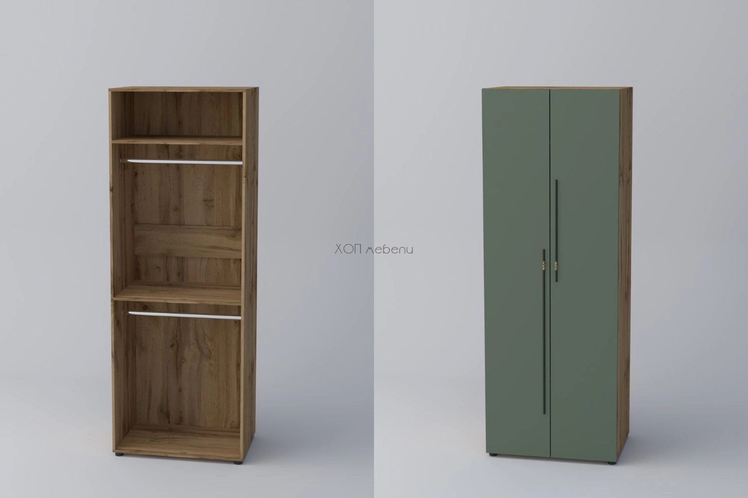 Гардероб с две врати СПЕЙС 2 с височина 220 см. и ширина 80 см. Удобно разпределение и компактни размери. Гардеробът разполага с два лоста за закачалки и два рафта.