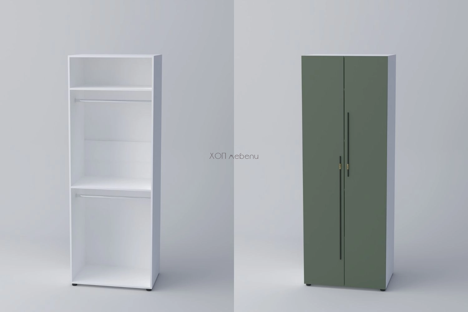 Гардероб с две врати СПЕЙС 2 с височина 220 см. и ширина 80 см. Удобно разпределение и компактни размери. Гардеробът разполага с два лоста за закачалки и два рафта.