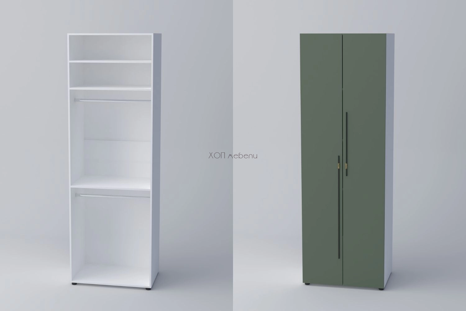 Гардероб с две врати СПЕЙС 2 с височина 240 см. и ширина 80 см. Удобно разпределение и компактни размери. Гардеробът разполага с два лоста за закачалки и три рафта.