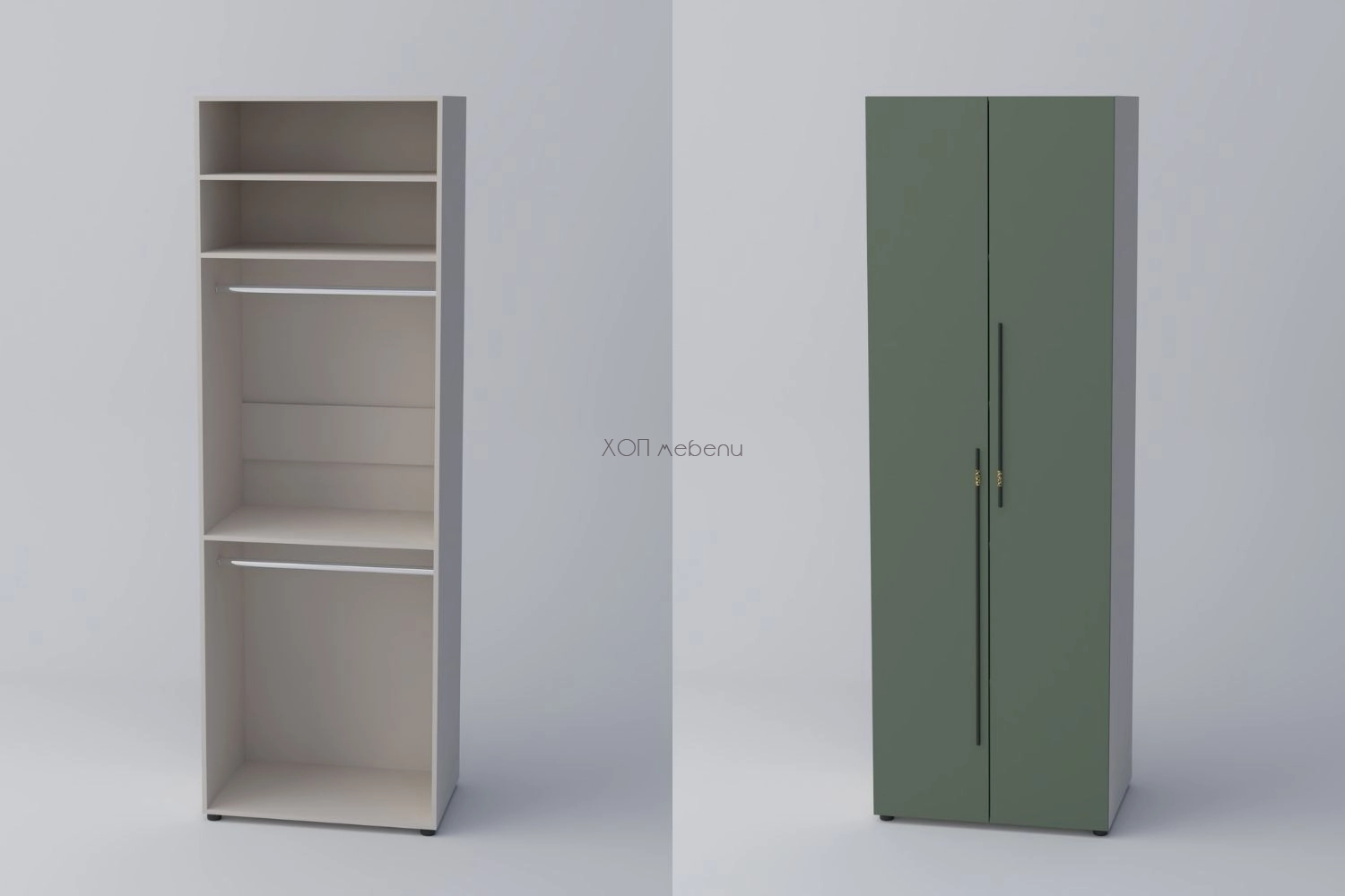 Гардероб с две врати СПЕЙС 2 с височина 240 см. и ширина 80 см. Удобно разпределение и компактни размери. Гардеробът разполага с два лоста за закачалки и три рафта.