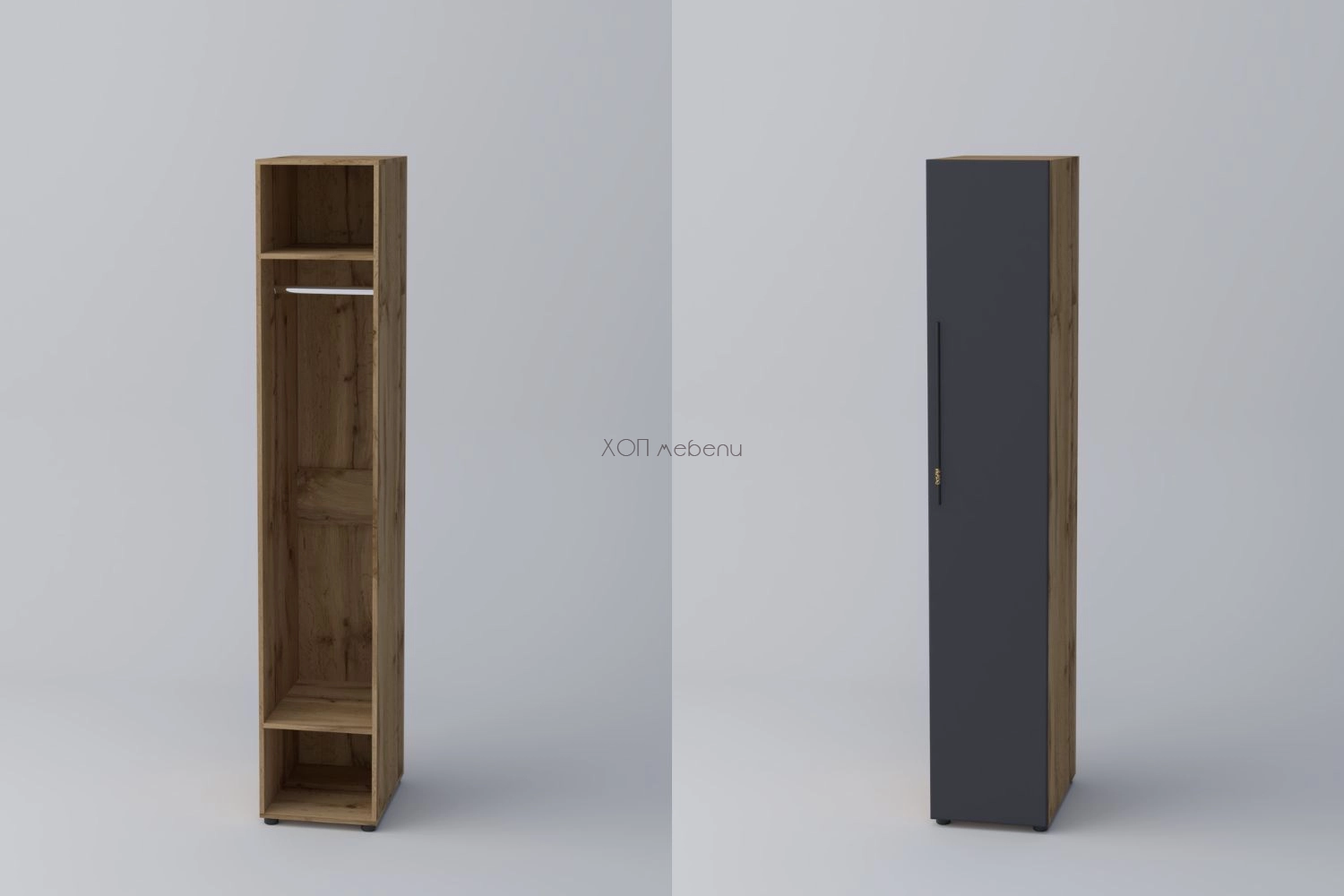 Еднокрилен гардероб СПЕЙС 1 с височина 220 см. и ширина 40 см. Удобно разпределение и компактни размери. Гардеробът разполага с един лост за закачалки и два рафта.