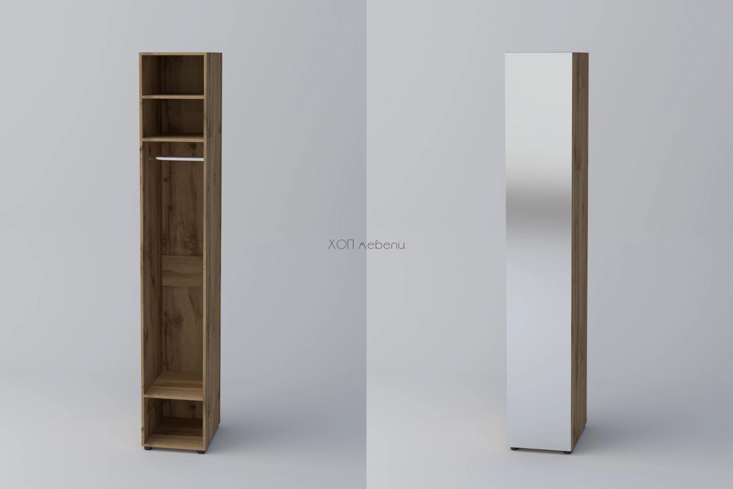 Еднокрилен гардероб СПЕЙС 1 с височина 240 см. и ширина 40 см. Врата изцяло с огледало. Удобно разпределение и компактни размери. Гардеробът разполага с един лост за закачалки и три рафта.