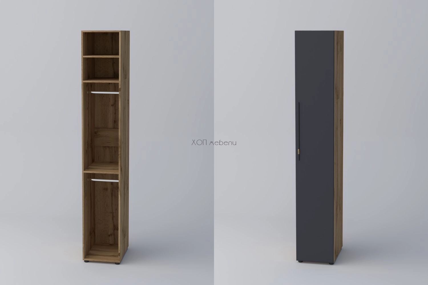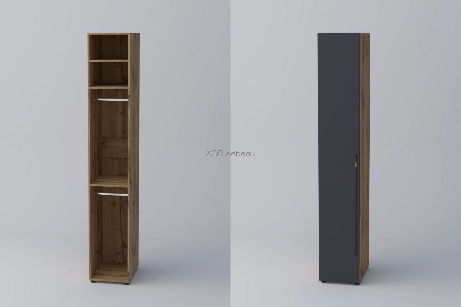 Еднокрилен гардероб СПЕЙС 2 с височина 240 см. и ширина 40 см. Удобно разпределение и компактни размери. Гардеробът разполага с два лоста за закачалки и три рафта.