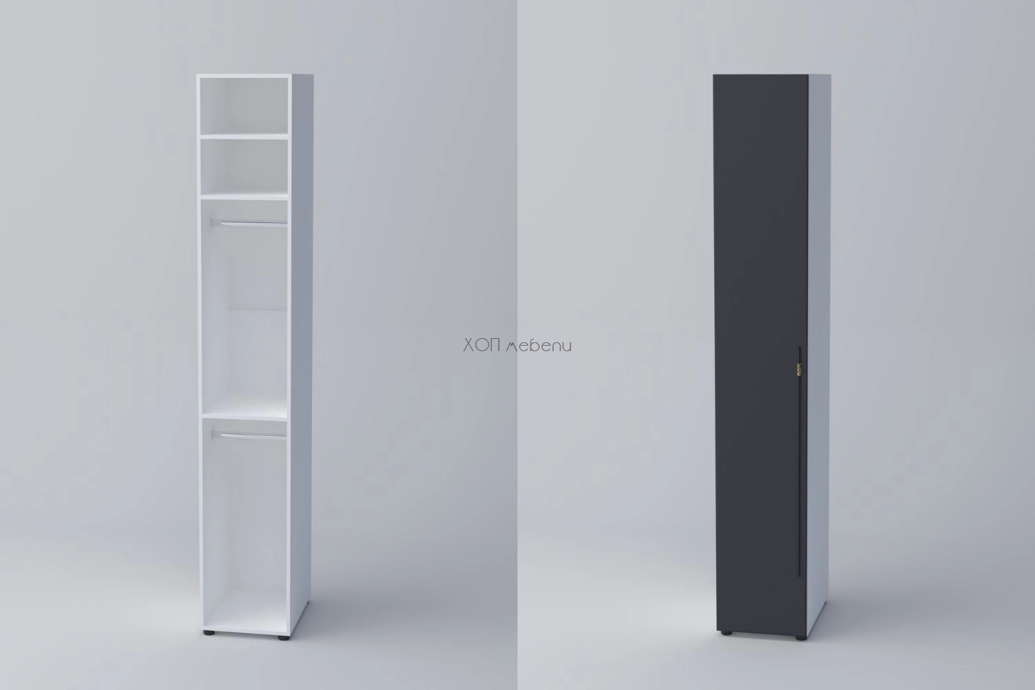 Еднокрилен гардероб СПЕЙС 2 с височина 240 см. и ширина 40 см. Удобно разпределение и компактни размери. Гардеробът разполага с два лоста за закачалки и три рафта.
