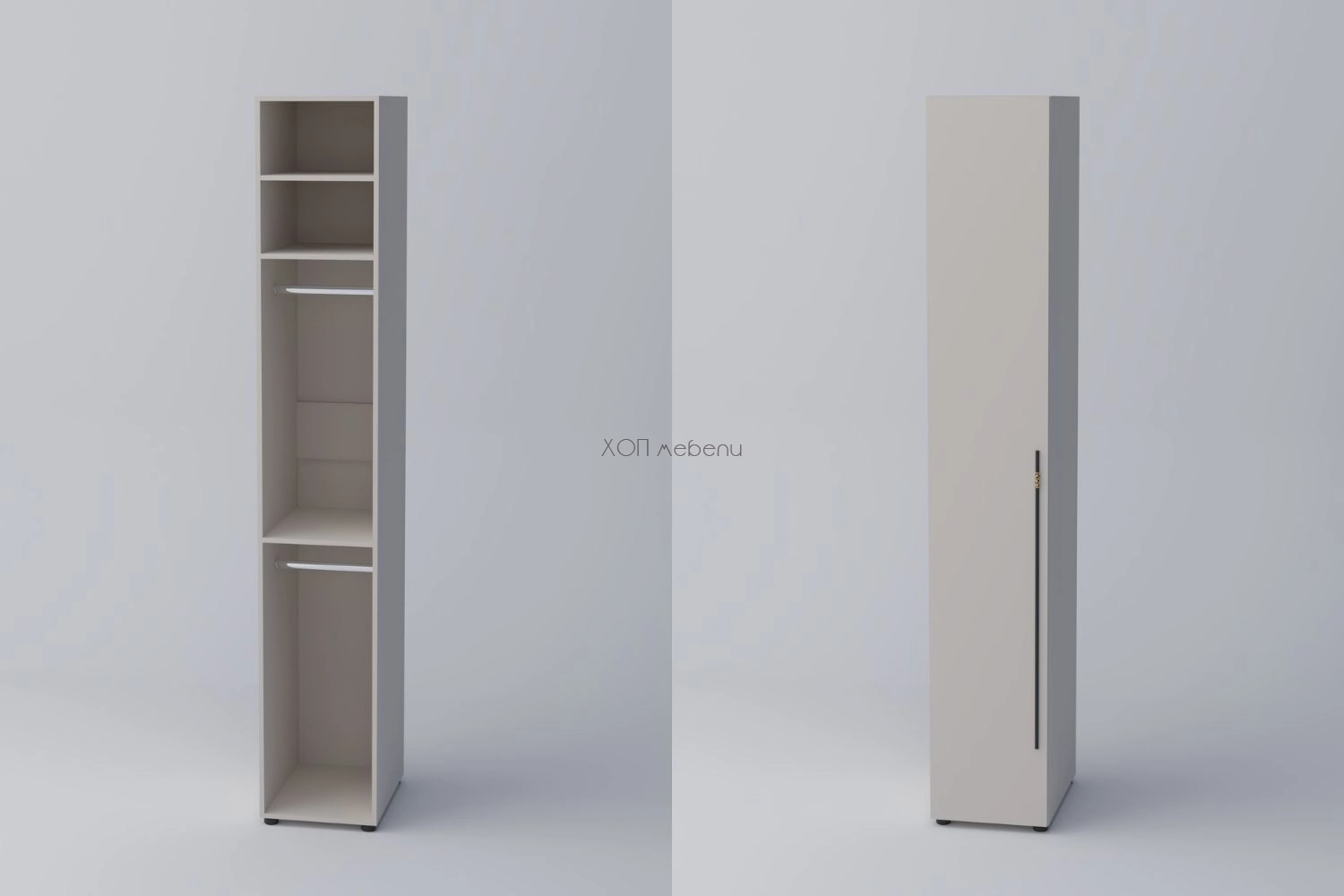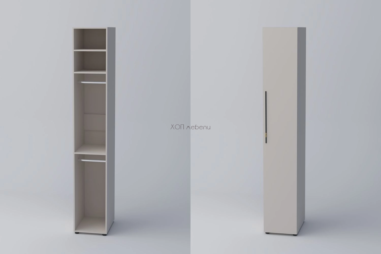 Еднокрилен гардероб СПЕЙС 2 с височина 240 см. и ширина 40 см. Удобно разпределение и компактни размери. Гардеробът разполага с два лоста за закачалки и три рафта. Изцяло в светъл цвят кашмир.