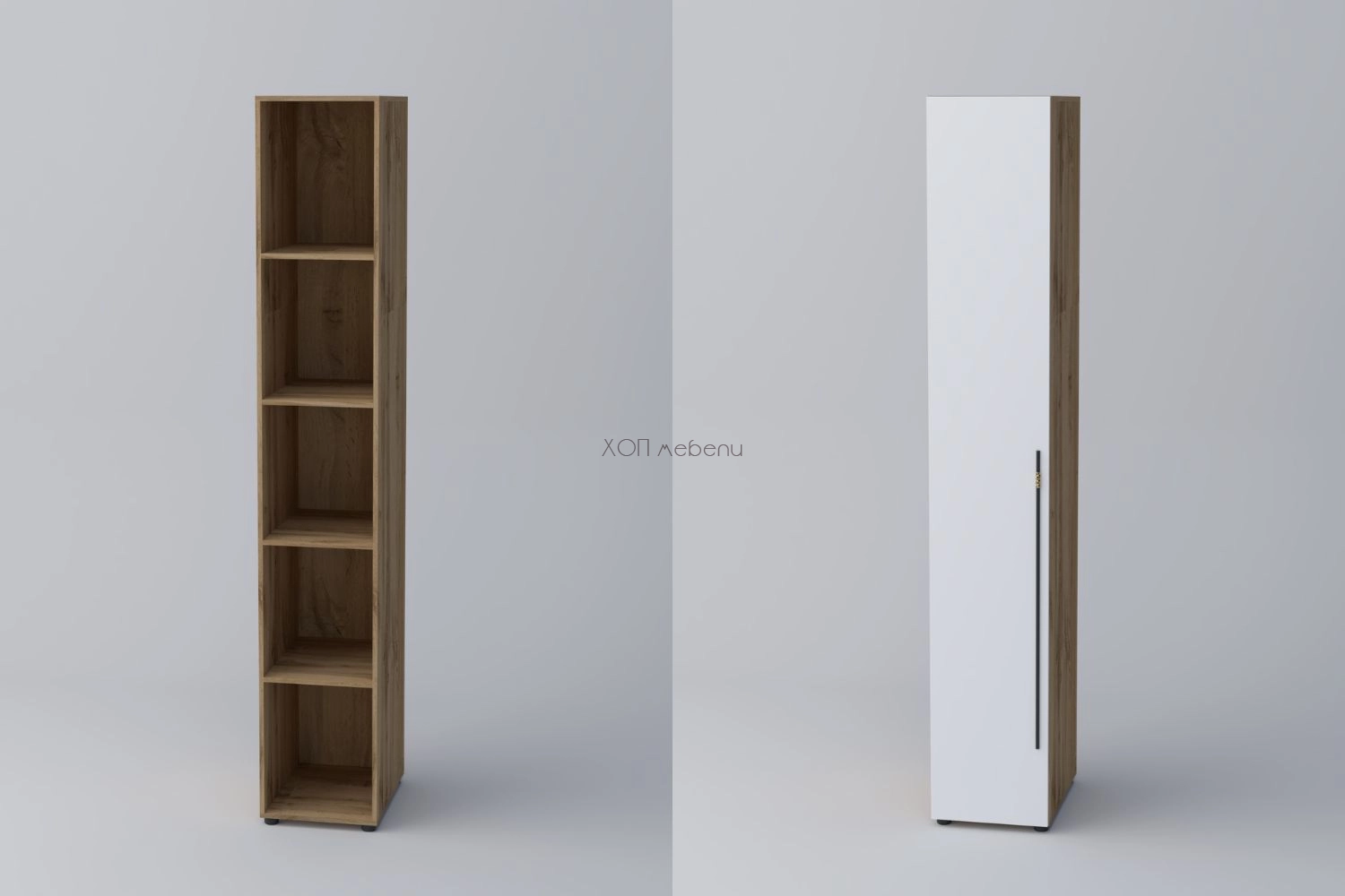 Еднокрилен гардероб СПЕЙС 3 с височина 240 см. и ширина 40 см. Удобно разпределение и компактни размери. Гардеробът разполага с четири рафта.