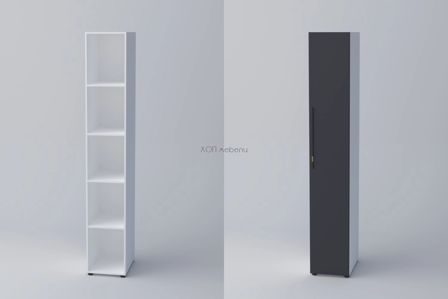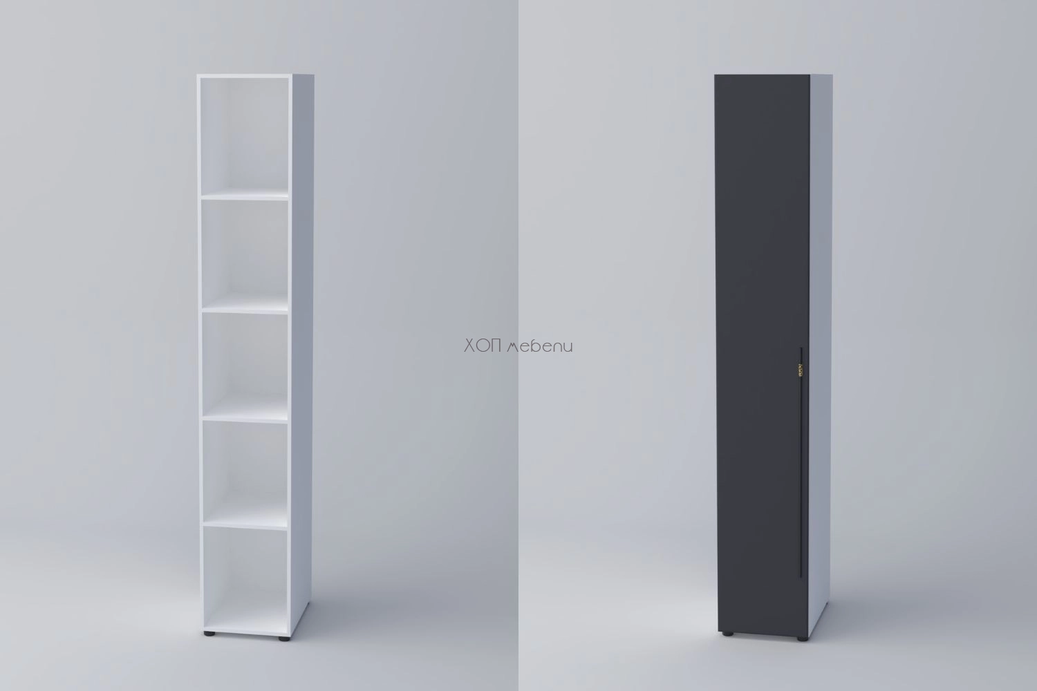 Еднокрилен гардероб СПЕЙС 3 с височина 240 см. и ширина 40 см. Удобно разпределение и компактни размери. Гардеробът разполага с четири рафта.
