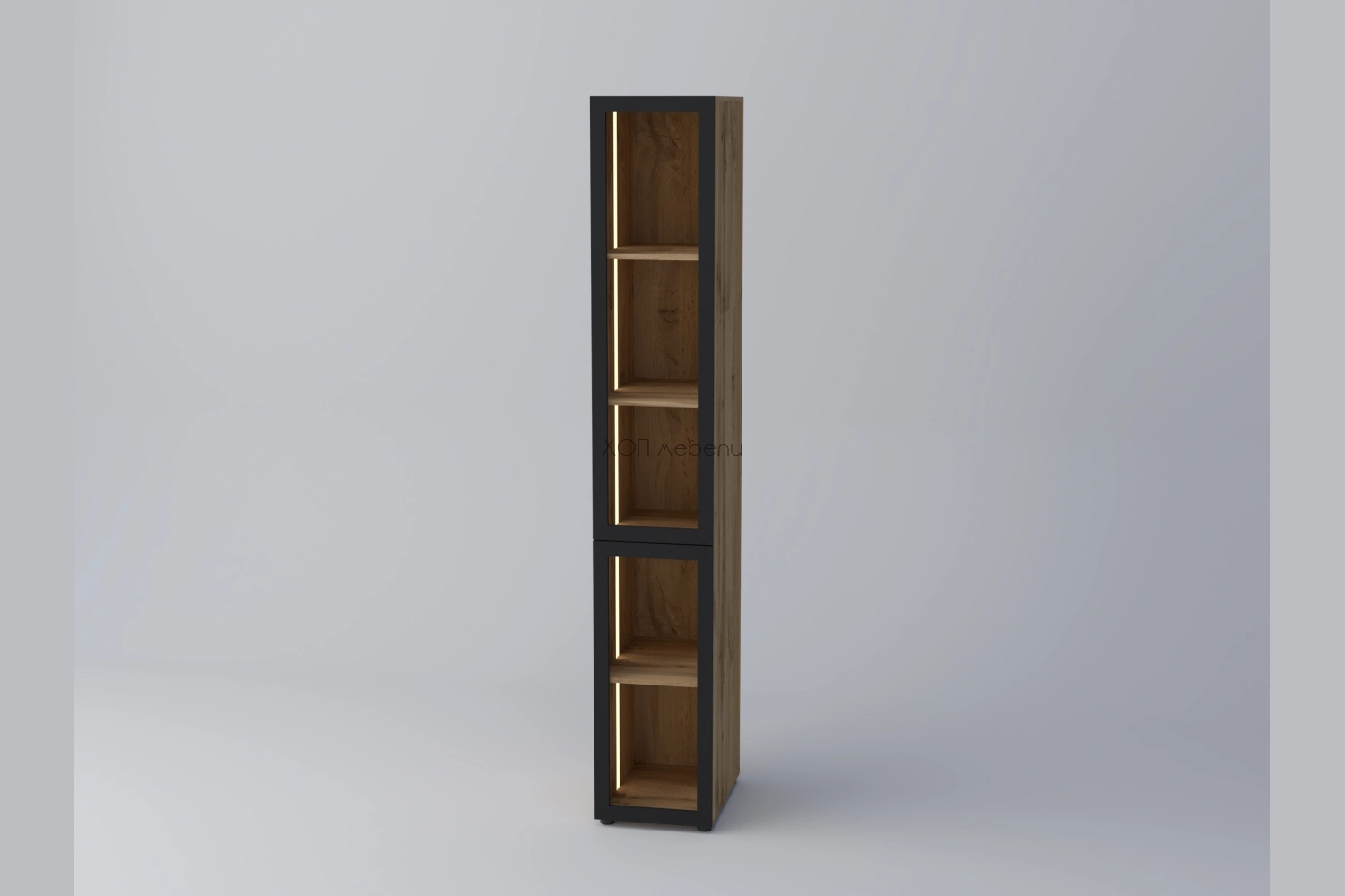 Модул с витрина СПЕЙС, височина 240 см. Корпус в дървесен декор дъб апалачи и четири рафта.