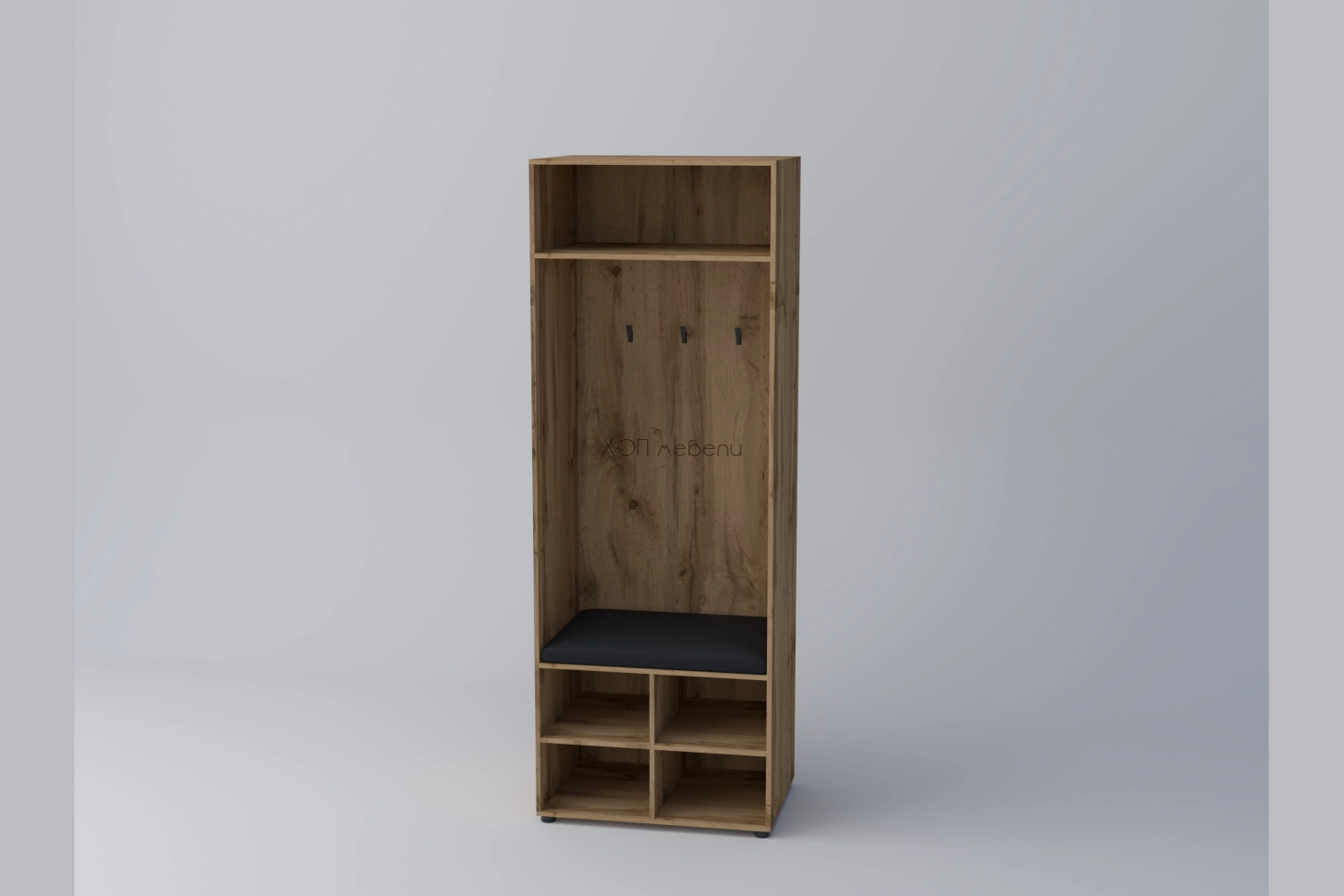 Обзавеждане за коридор СПЕЙС с височина 220 см. и ширина 80 см. Удобно разпределение със закачалки, рафт, възглавница и четири ниши за обувки.