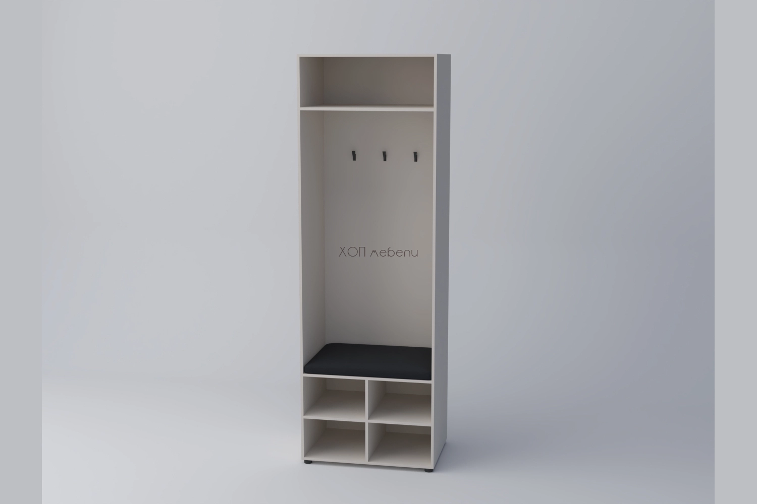 Обзавеждане за коридор СПЕЙС с височина 240 см. и ширина 80 см. Удобно разпределение със закачалки, рафт, възглавница и четири ниши за обувки.