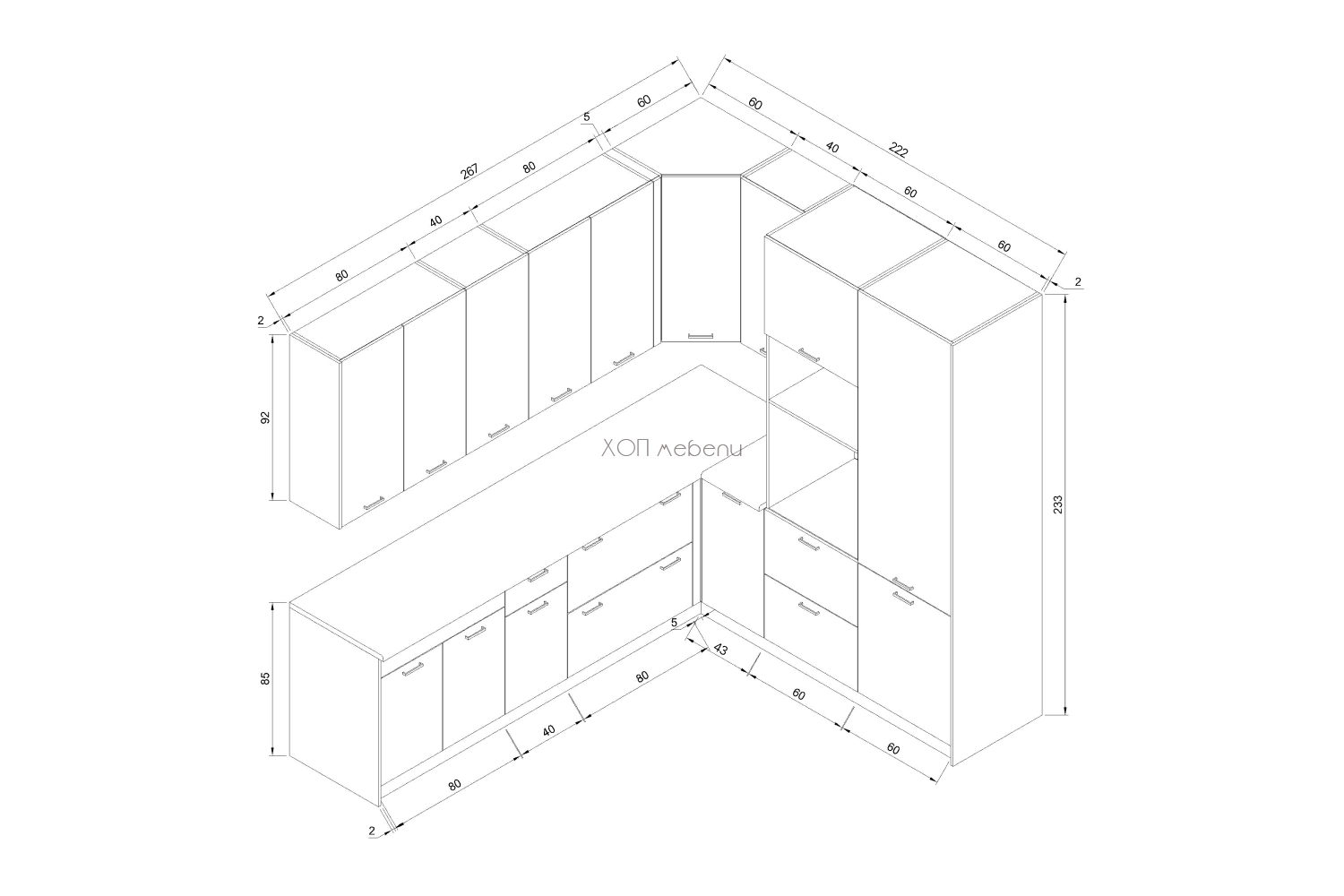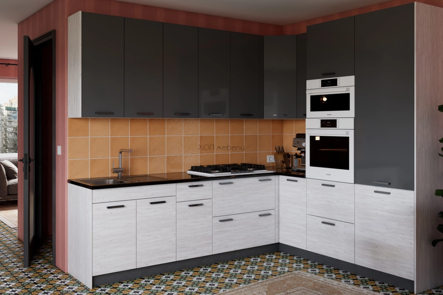 Кухня Марта 267/222 см. е с модерна визия и стандартни размери. Модерна цветова комбинация в дъб артууд и графит гланц. Идеално решение за всяко помещение!
