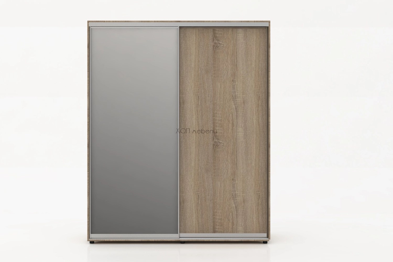 Тази конфигурация на гардероб Алфа е в цвят сонома с една плътна и една огледална врата.