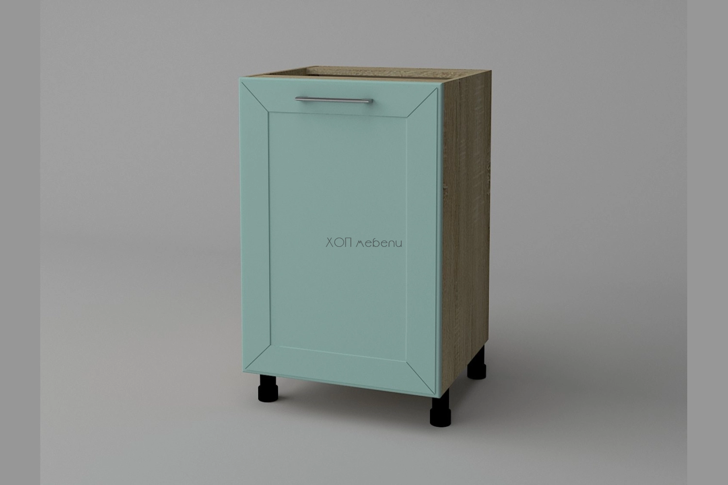 Долен кухненски шкаф Марго с ширина 50 см. С лице в страхотен цвят лагуна и корпус в дървесен цвят дъб сонома. С една врата и рафт!
