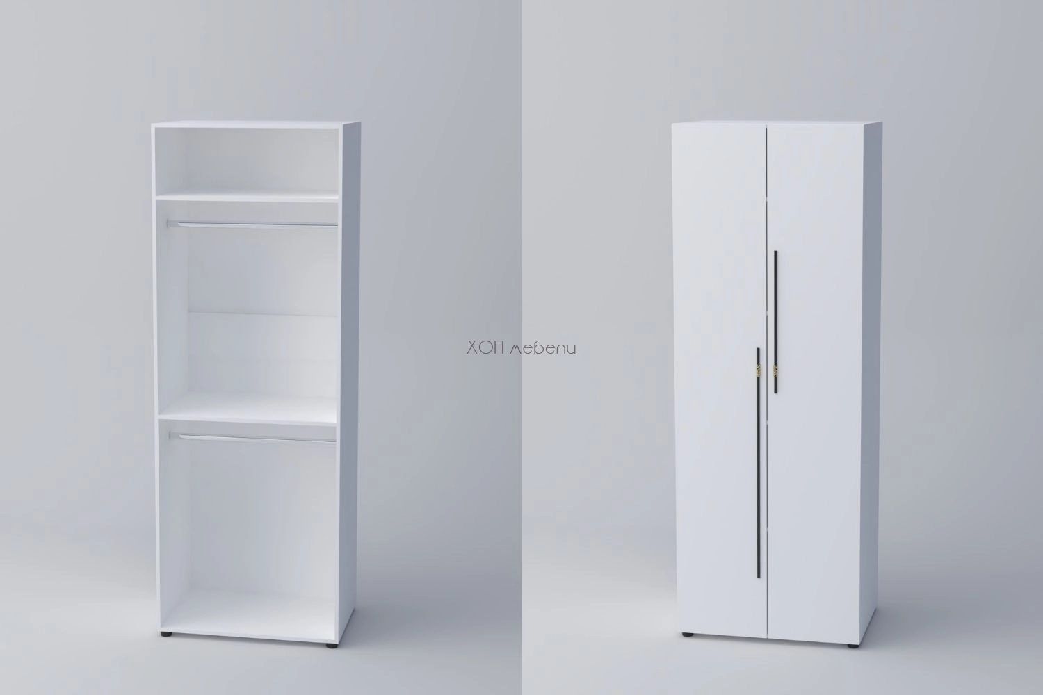 Гардероб с две врати СПЕЙС 2 с височина 220 см. и ширина 80 см. Удобно разпределение и компактни размери. Гардеробът разполага с два лоста за закачалки и два рафта.