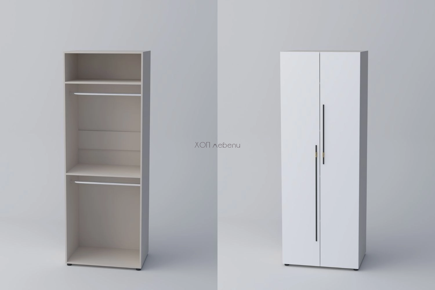 Гардероб с две врати СПЕЙС 2 с височина 220 см. и ширина 80 см. Удобно разпределение и компактни размери. Гардеробът разполага с два лоста за закачалки и два рафта.
