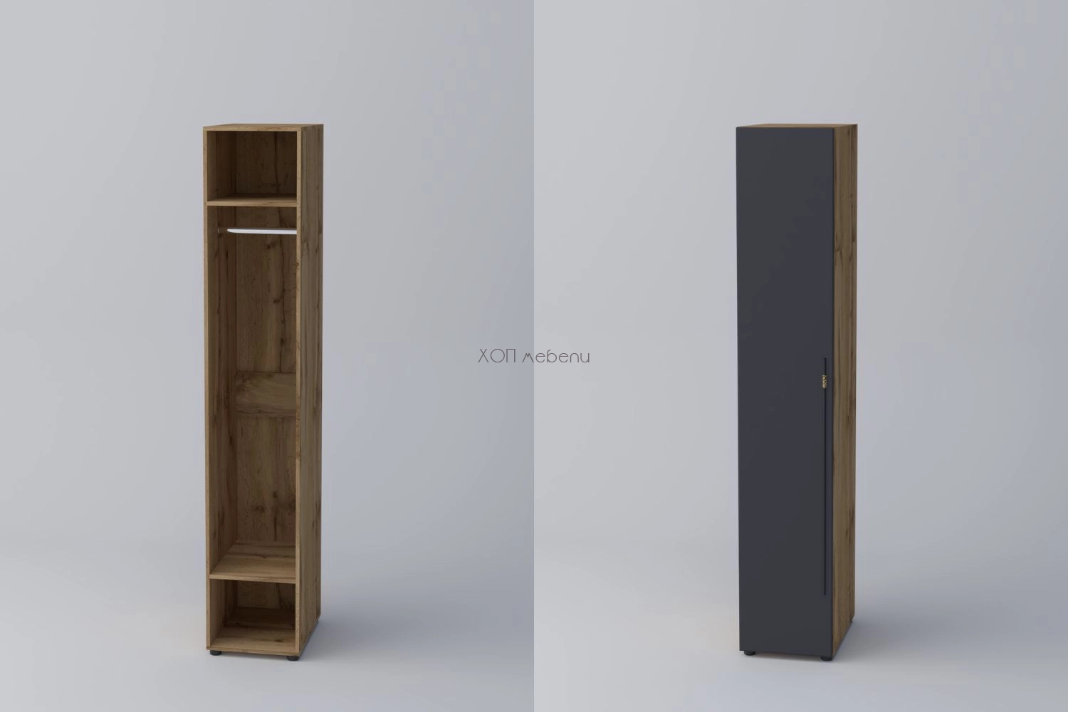 Еднокрилен гардероб СПЕЙС 1 с височина 220 см. и ширина 40 см. Удобно разпределение и компактни размери. Гардеробът разполага с един лост за закачалки и два рафта.