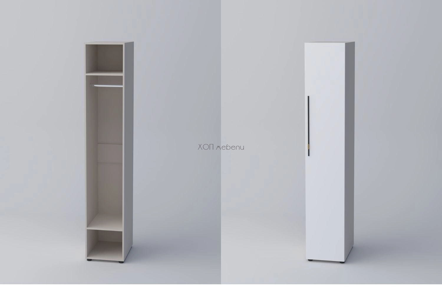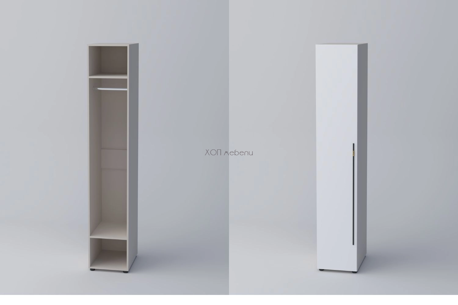 Еднокрилен гардероб СПЕЙС 1 с височина 220 см. и ширина 40 см. Удобно разпределение и компактни размери. Гардеробът разполага с един лост за закачалки и два рафта.