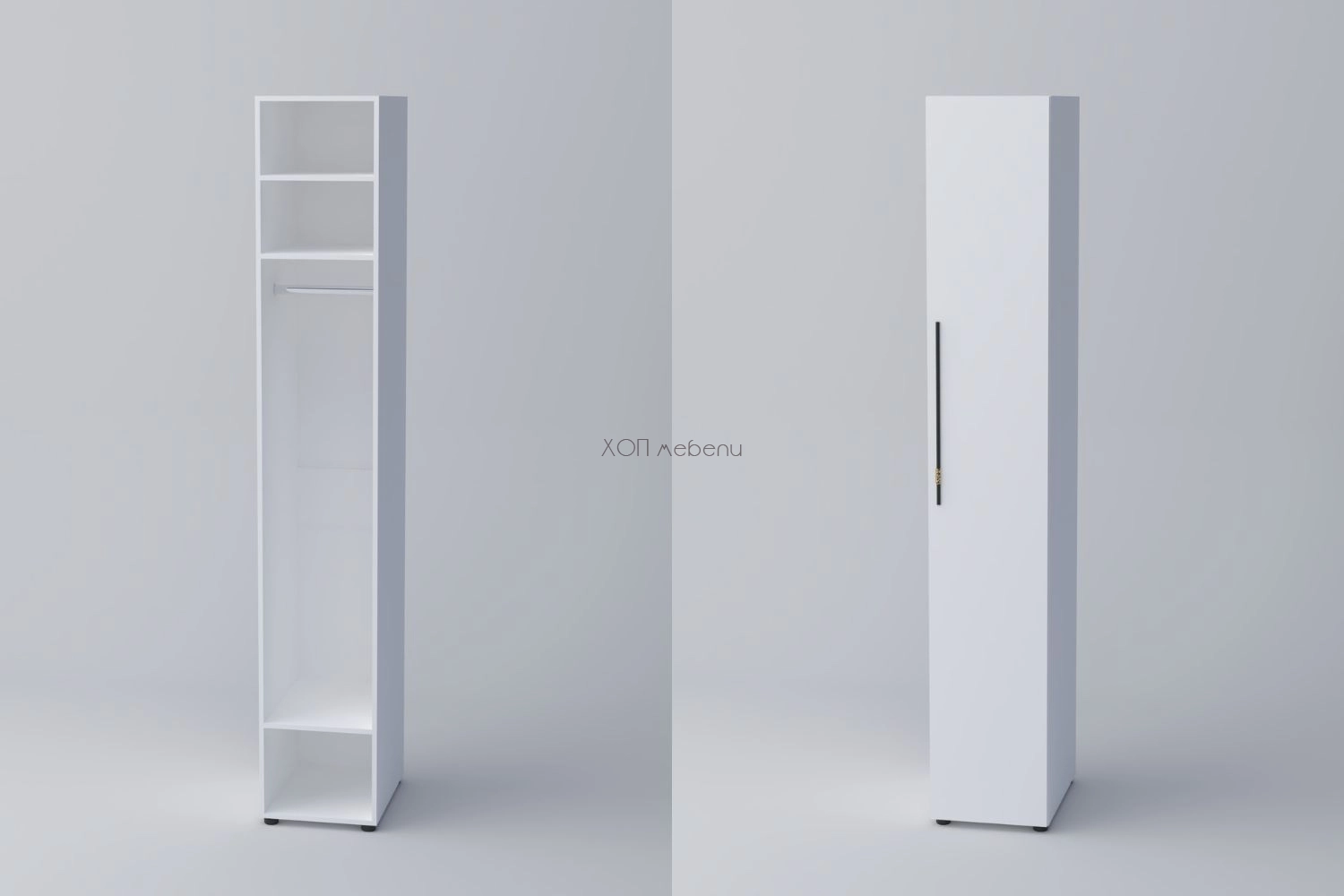 Еднокрилен гардероб СПЕЙС 1 с височина 240 см. и ширина 40 см. Удобно разпределение и компактни размери. Гардеробът разполага с един лост за закачалки и три рафта. Изцяло в класически бял цвят.
