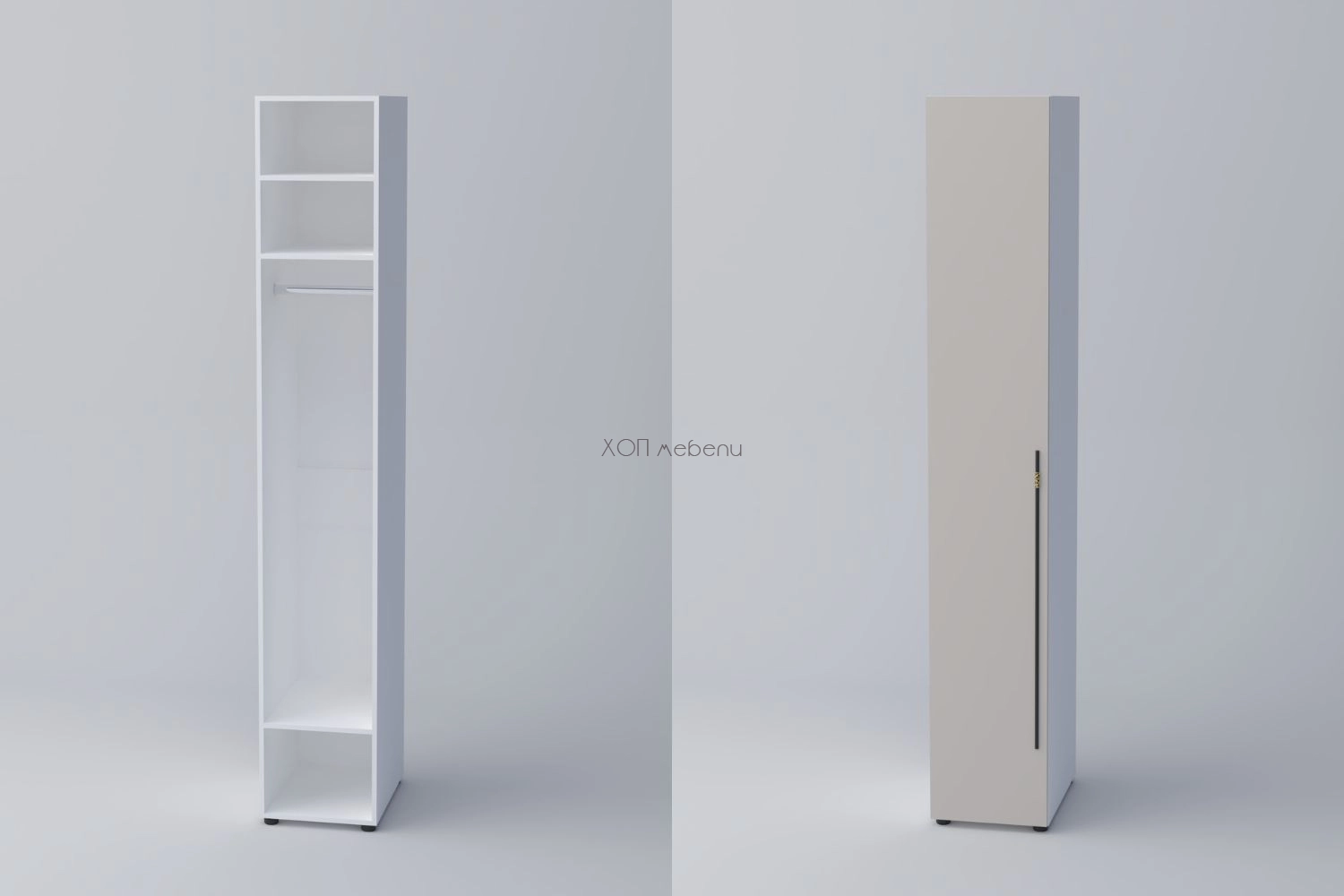 Еднокрилен гардероб СПЕЙС 1 с височина 240 см. и ширина 40 см. Удобно разпределение и компактни размери. Гардеробът разполага с един лост за закачалки и три рафта.