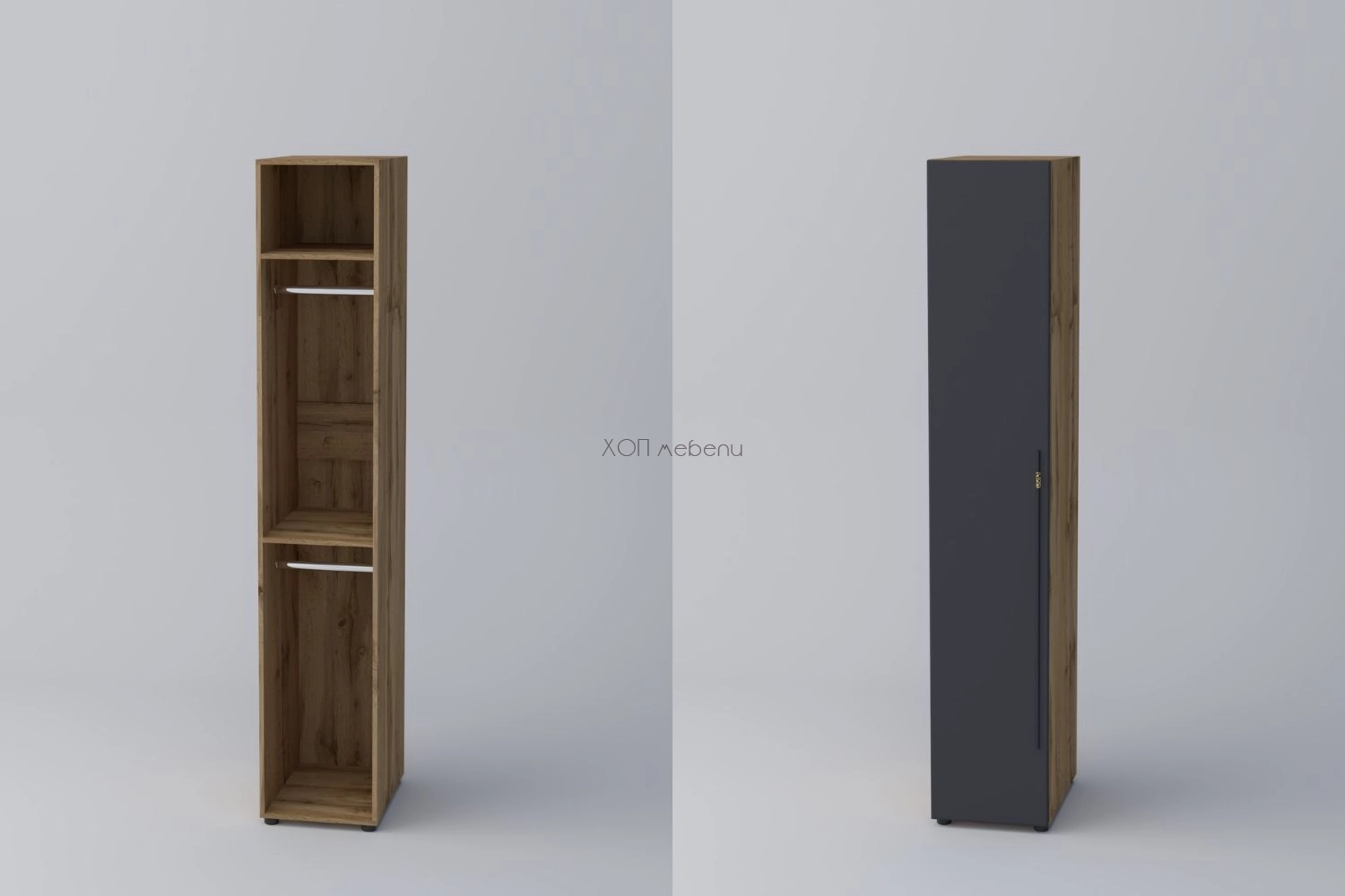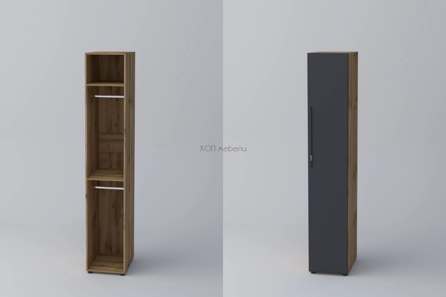 Еднокрилен гардероб СПЕЙС 2 с височина 220 см. и ширина 40 см. Удобно разпределение и компактни размери. Гардеробът разполага с два лоста за закачалки и два рафта.