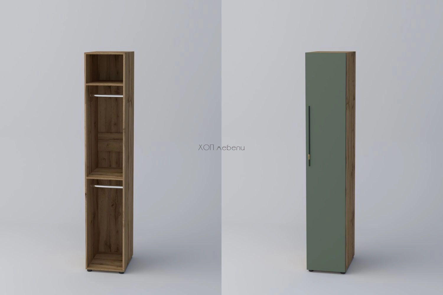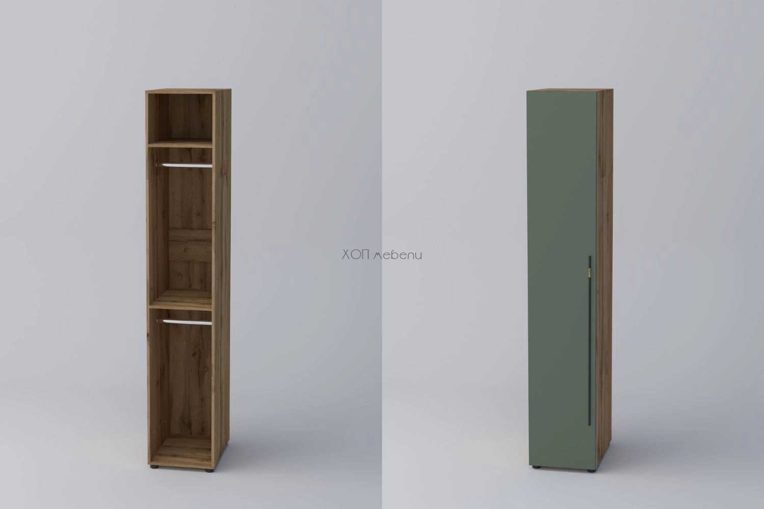 Еднокрилен гардероб СПЕЙС 2 с височина 220 см. и ширина 40 см. Удобно разпределение и компактни размери. Гардеробът разполага с два лоста за закачалки и два рафта.