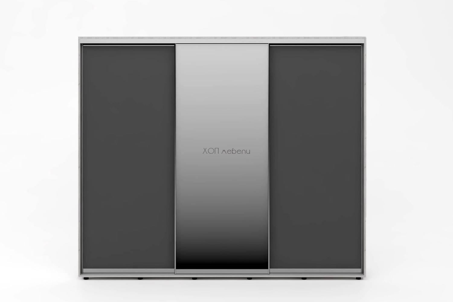 Тази конфигурация на гардероб Алфа е с корпус в цвят артууд, с две плътни врати в графит и една огледална врата.