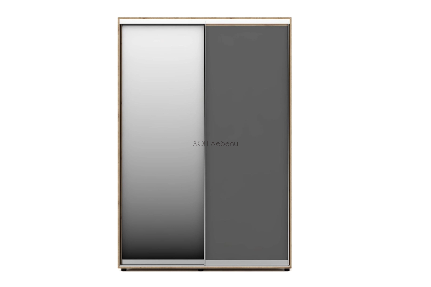 Тази конфигурация на гардероб Алфа е в цвят дъб артисан и графит. С една плътна и една огледална врата.