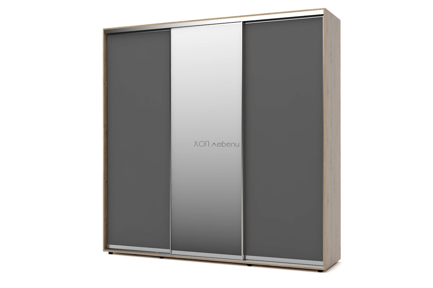 Тази конфигурация на гардероб Алфа е с корпус в дъб артисан и лице в графит. С две плътни и една огледална врата.