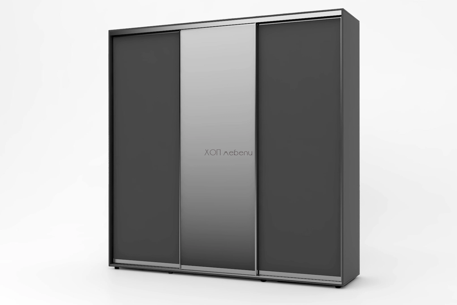 Тази конфигурация на гардероб Алфа е с корпус и лице в цвят графит, с две плътни врати и една огледална врата.