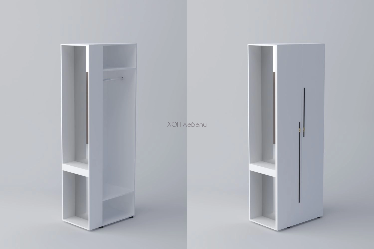 В предната си част шкафът разполага с две врати, лост за дрехи на закачалка и два рафта, а отстрани има чекмедже за козметика и дребни вещи. Практично разпределение, което позволява да се използва цялото пространство на модула.