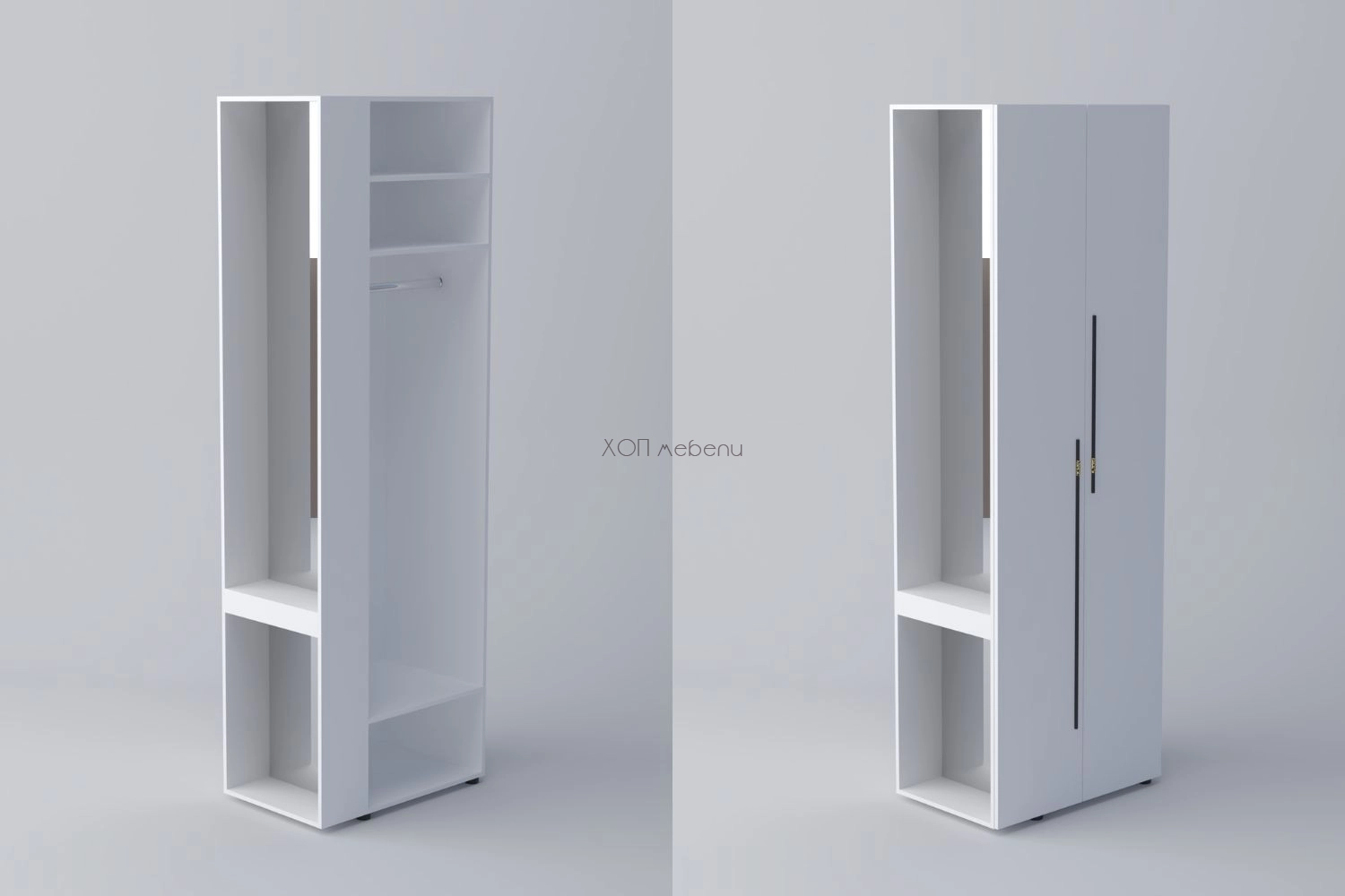В предната си част шкафът разполага с две врати, лост за дрехи на закачалка и три рафта, а отстрани има чекмедже за козметика и дребни вещи. Практично разпределение, което позволява да се използва цялото пространство на модула.