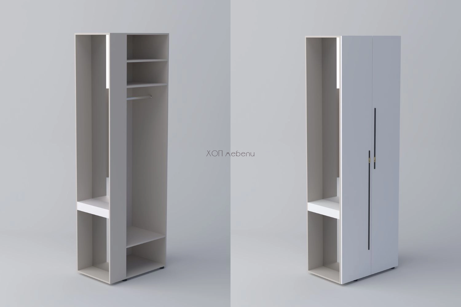 В предната си част шкафът разполага с две врати, лост за дрехи на закачалка и три рафта, а отстрани има чекмедже за козметика и дребни вещи. Практично разпределение, което позволява да се използва цялото пространство на модула.