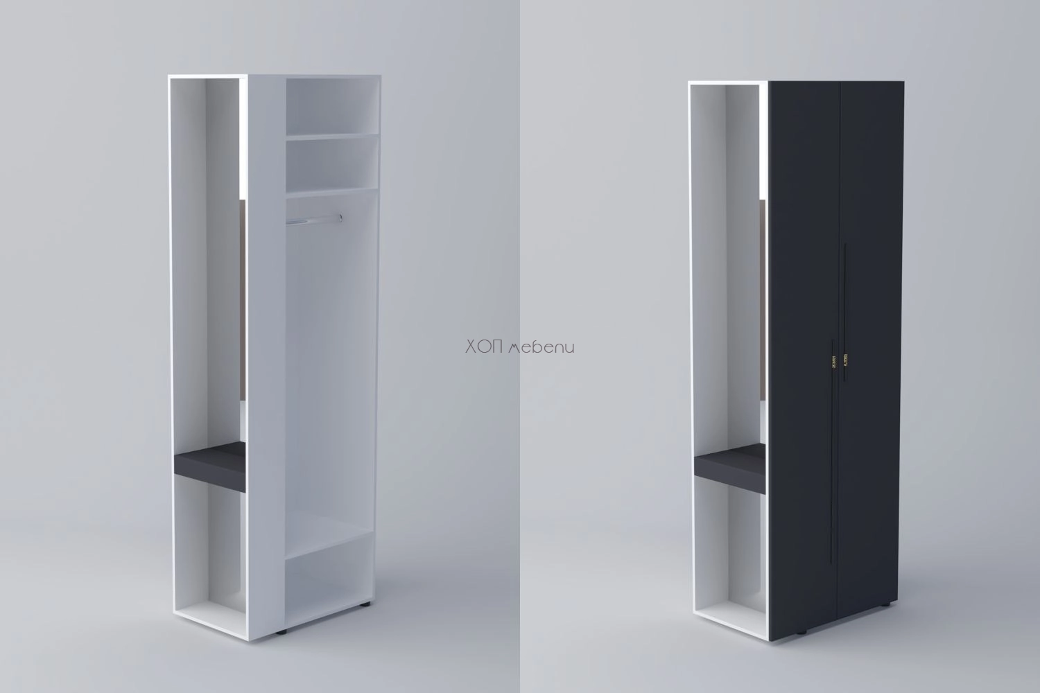 В предната си част шкафът разполага с две врати, лост за дрехи на закачалка и три рафта, а отстрани има чекмедже за козметика и дребни вещи. Практично разпределение, което позволява да се използва цялото пространство на модула.