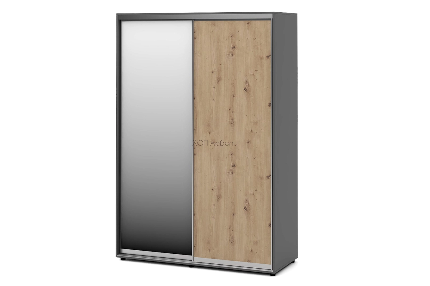 Тази конфигурация на гардероб Алфа е с корпус в цвят графит, с една плътна и една огледална врата. Лицето е в дъб артисан.