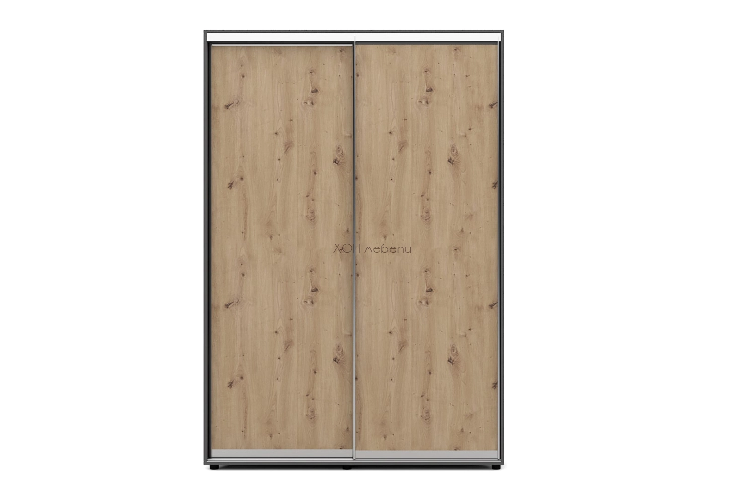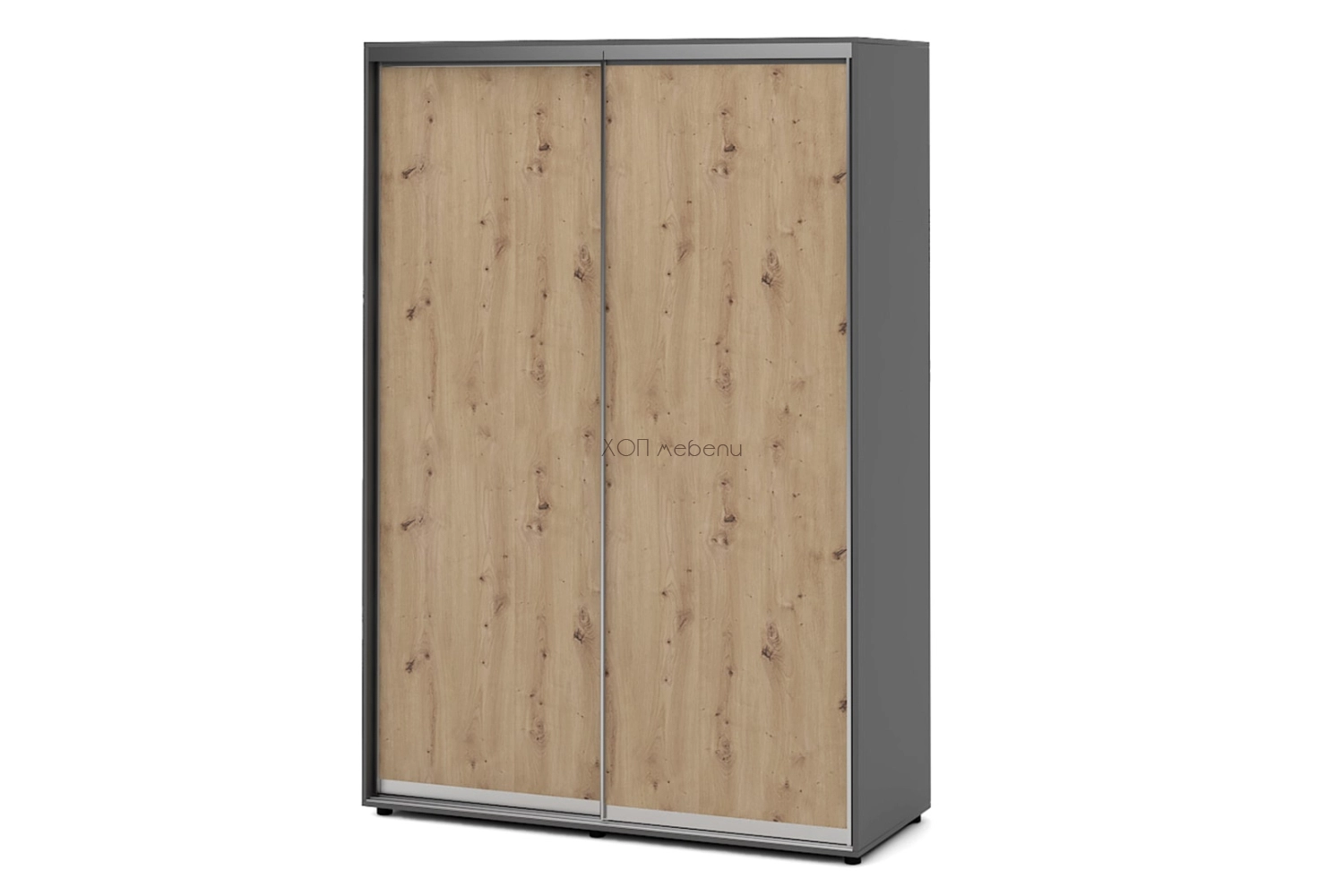 Тази конфигурация на гардероб Алфа е с две плътни врати. С корпус в сив цвят графит и лице в дъб артисан с дървесни жилки.