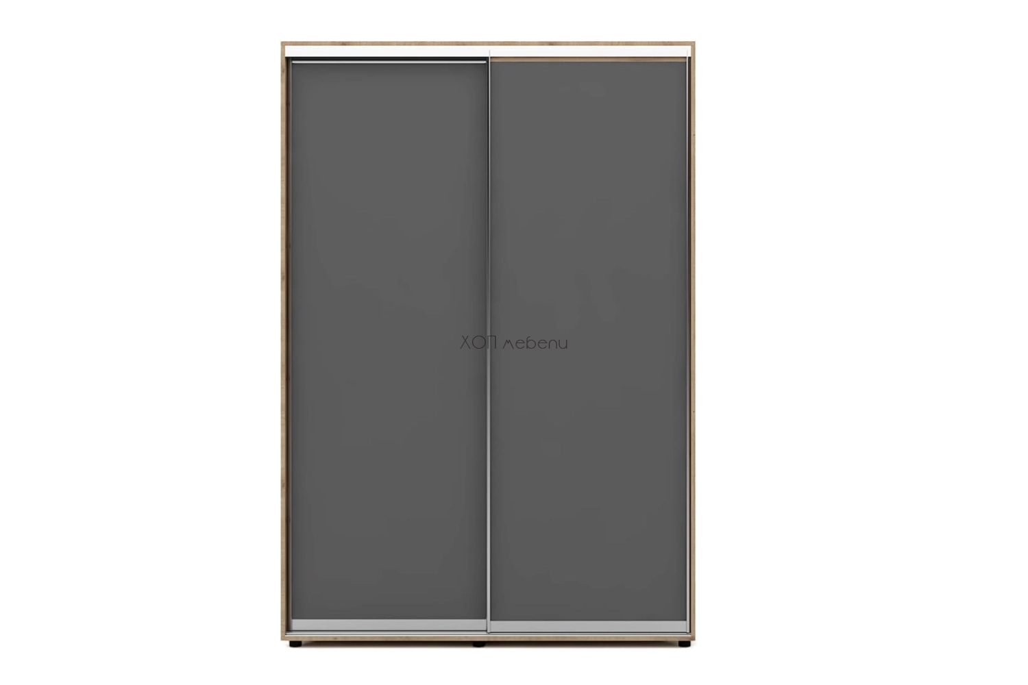 Тази конфигурация на гардероб Алфа е с две плътни врати. Лице в цвят графит и корпус в дъб артисан.