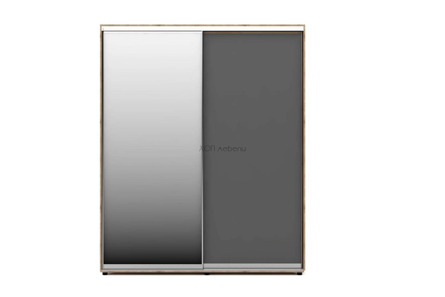 Тази конфигурация на гардероб Алфа е в цвят дъб артисан и графит, с една плътна и една огледална врата.