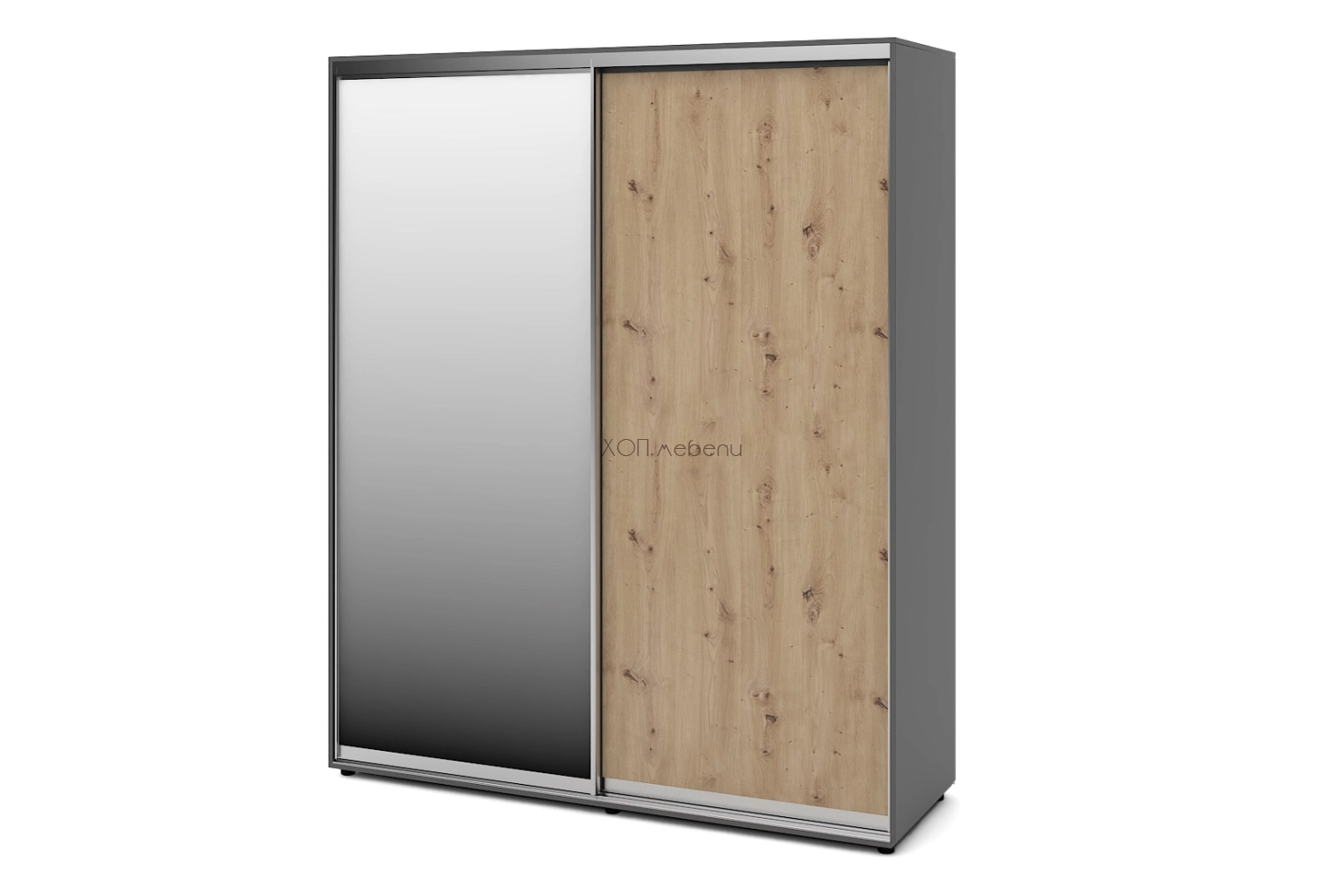 Тази конфигурация на гардероб Алфа е с лице в дъб артисан и корпус графит, с една плътна и една огледална врата.