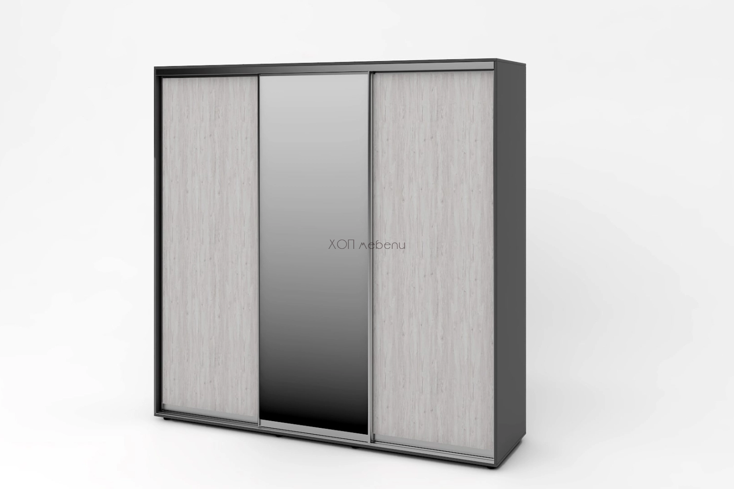 Тази конфигурация на гардероб Алфа е с корпус в графит и лице в модерен светъл цвят артууд. С две плътни и една огледална врата.