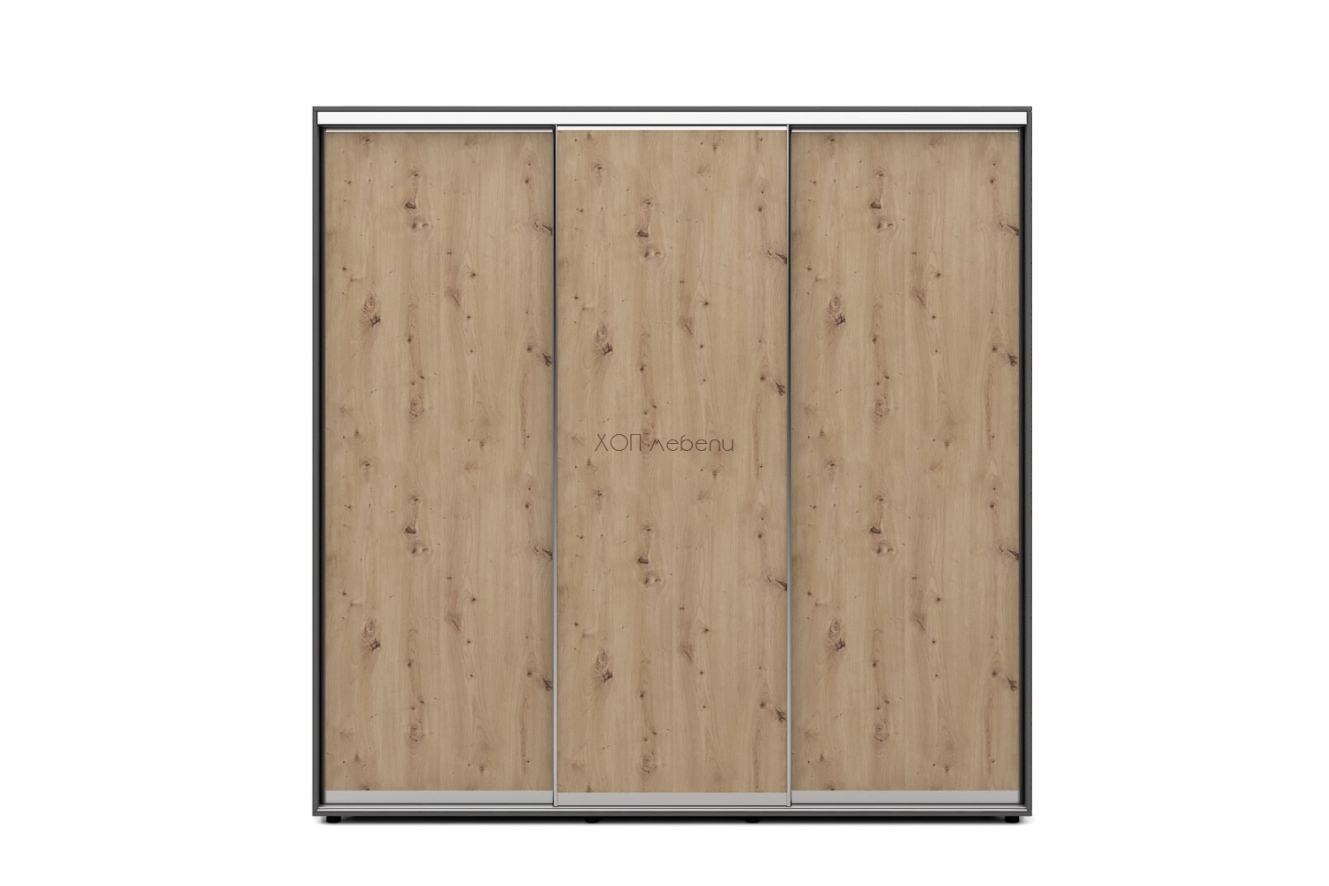 Тази конфигурация на гардероб Алфа е с корпус в цвят графит и лице в цвят дъб артисан, с три плътни врати.