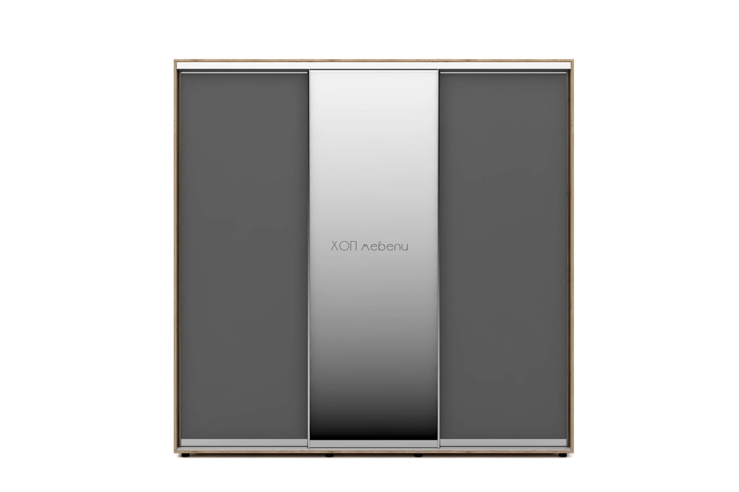 Тази конфигурация на гардероб Алфа е с корпус в цвят артисан. С две плътни врати в графит и една огледална врата.