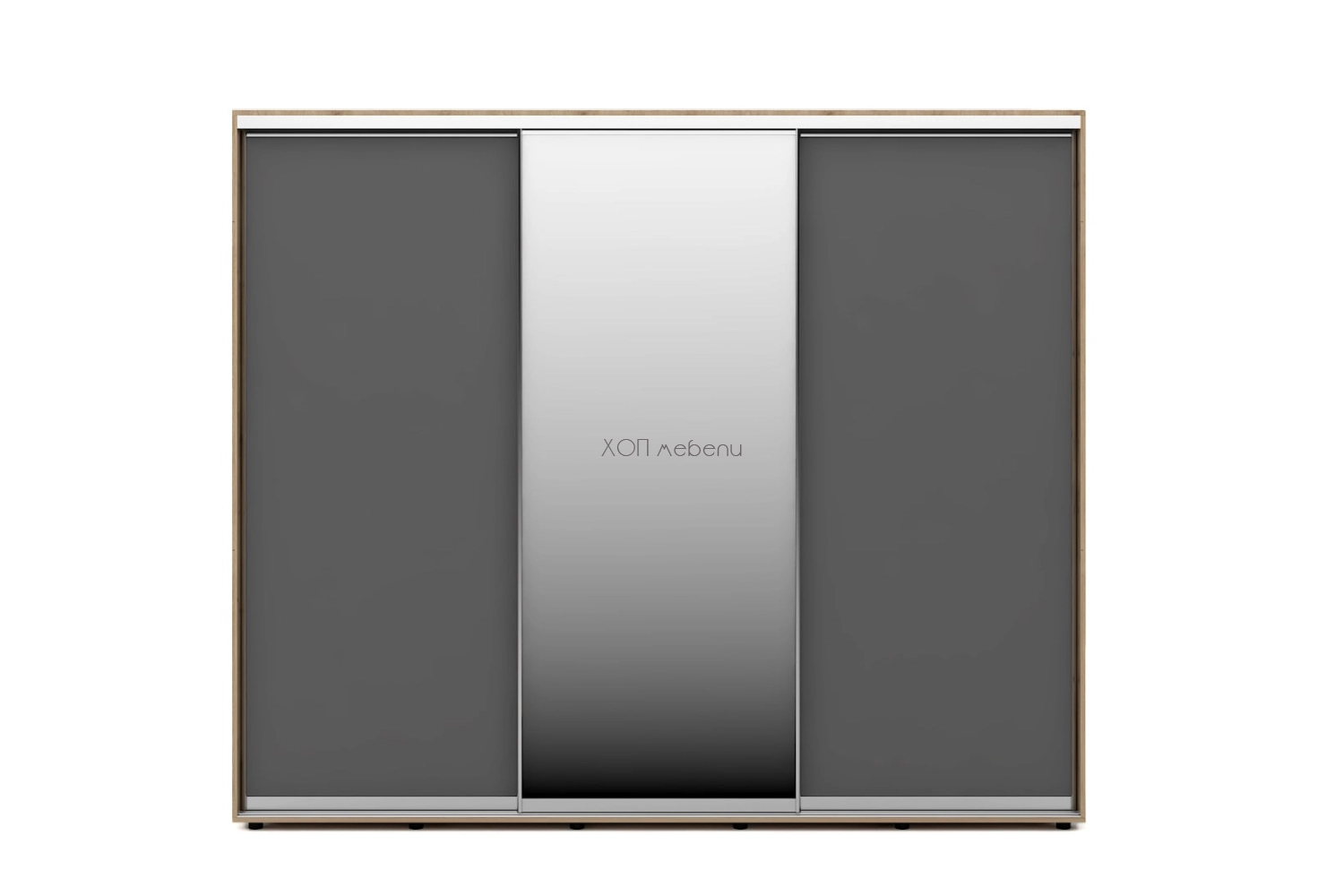 Тази конфигурация на гардероб Алфа е с корпус в цвят дъб артисан, с две плътни врати в графит и една огледална врата.