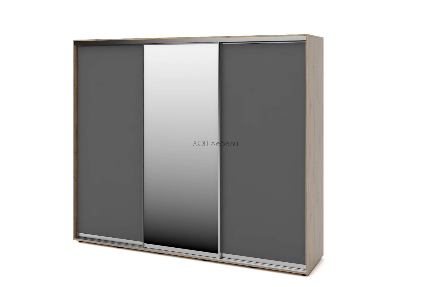 Тази конфигурация на гардероб Алфа е с корпус в цвят дъб артисан, с две плътни врати в графит и една огледална врата.