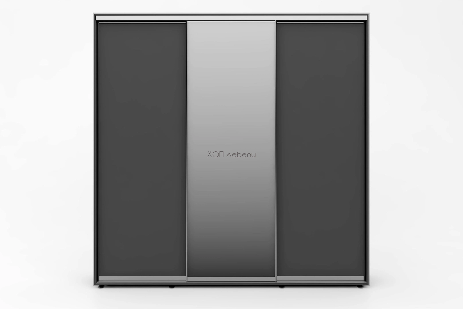 Тази конфигурация на гардероб Алфа е с корпус и лице в цвят графит, с две плътни врати и една огледална врата.